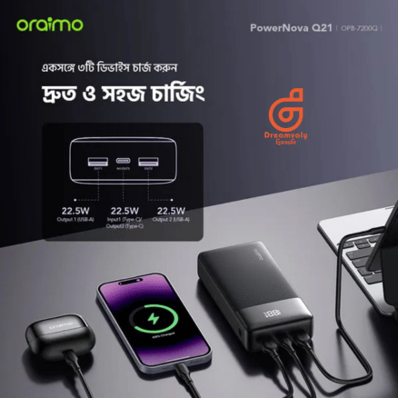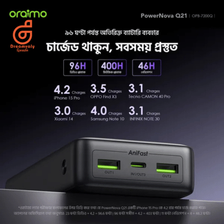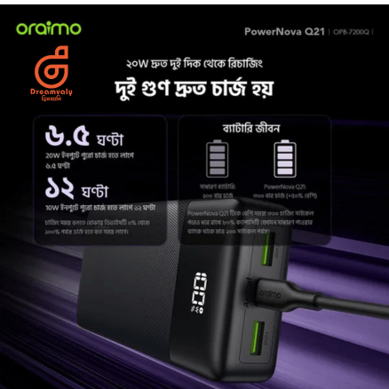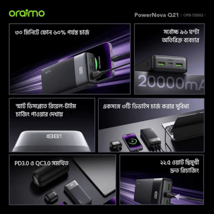 Oraimo PowerNova Q21 পাওয়ার ব্যাংক অসাধারণ! ব্যাটারিতে একাধিকবার চার্জ করা যায়, আর ফাস্ট চার্জিং সত্যিই দ্রুত কাজ করে। বিল্ড কোয়ালিটি মজবুত, ডিজাইনও প্রিমিয়াম। ভ্রমণ বা দৈনন্দিন ব্যবহারে খুবই নির্ভরযোগ্য।